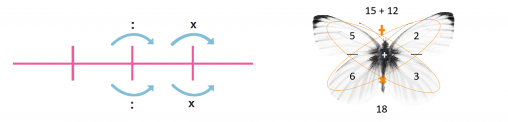 Hoewel er in de basis niets mis is met de verhoudingstabel zie ik nu in het gebruik te vaak een dogmatische aanpak. De verhoudingstabel op de rekenkaart van de coöperatie examens mbo (CEM) is daar wat mij betreft een illustratie van (zie plaatje hierboven links). Het illustreert het stappenplan dat bij het rekenen met verhoudingen als dominante strategie aan leerlingen wordt aangeboden: eerst terugrekenen naar de 1 en dan naar het gewenste aantal rekenen. Op deze manier is de verhoudingstabel niets meer of minder dan een visuele reminder voor een te volgen stappenplan. Het is net zoals de vlinder voor het optellen van breuken, waar ik wel vaker over spreek (plaatje rechts). En dat is jammer, want het rekenen met verhoudingen kan met zoveel meer begrip en zoveel krachtiger.