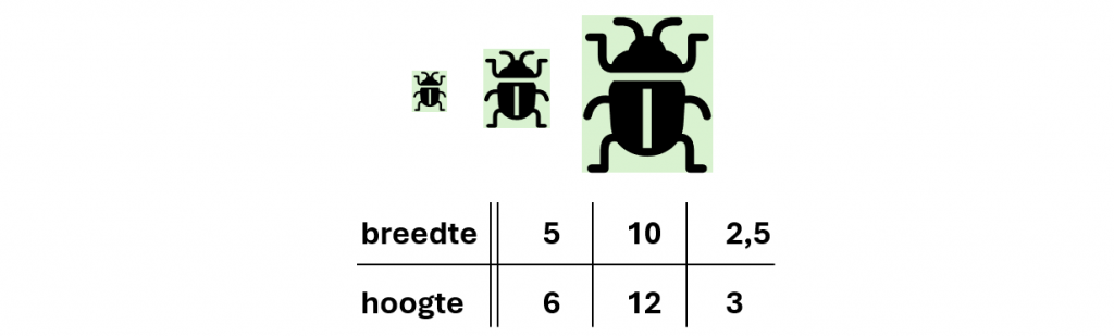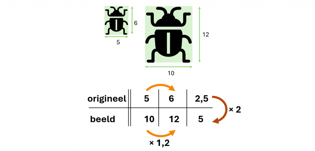 Dat betekent dat alle afmetingen in het beeld twee keer zo groot zijn. De hoogte, de breedte, maar bijvoorbeeld ook de streep op de rug van de kever. In de verhoudingstabel zie je de getallen op de onderste regel 2 keer zo groot zijn als de getallen op de bovenste regel. Er is dus een vaste factor van 2 tussen de twee rijen. Je kunt dit aangeven met een verticale pijl.