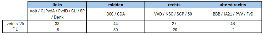 In de Buitenhof uitzending van 2 november 2025 merkte Henk Kamp dan ook op dat rechts samen meer dan 90 zetels heeft. Tom-Jan Meeus nuanceerde dat beeld. Hij merkte op dat je in de praktijk rechts niet als één groep zou mogen zien. Een indeling in rechts en uiterst rechts lijkt hier dus meer op zijn plek. Dan is het ook logisch om meteen de middenpartijen apart te nemen. Ook hier is de positie van de CU weer lastig (centrum of links). De positie van BBB is ook niet eenduidig. Voor sommige wetenschappers horen ze al bij uiterst rechts, anderen twijfelen nog.