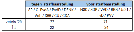 Je kunt zelf natuurlijk ook andere indelingen maken. Zoals op basis van de omstreden motie om illegaliteit strafbaar te stellen. Je zou kunnen kijken hoe het met de partijen gaat die tegen of voor hebben gestemd: